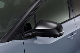 Transparante beschermfolie die de buitenspiegel van de Subaru Solterra beschermt tegen krassen en steenslag.